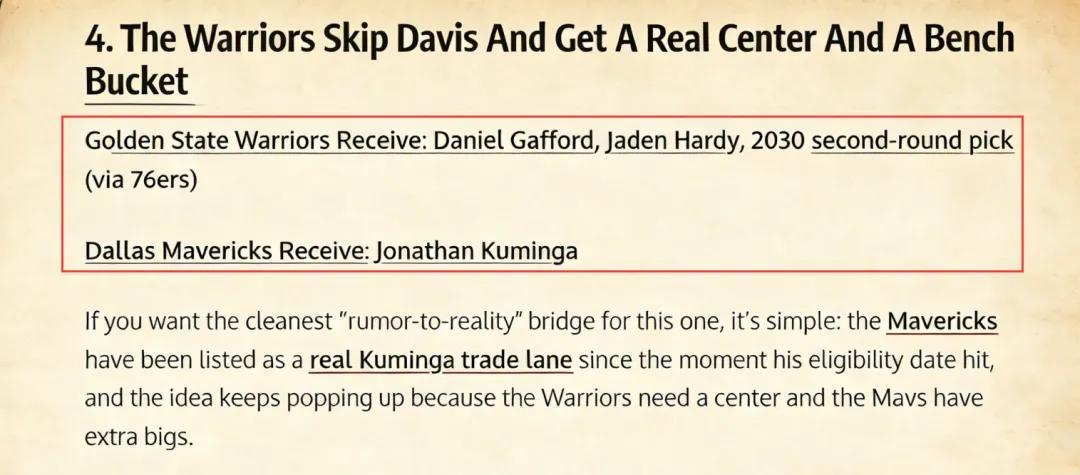美媒《Fadeaway World》撰文建议,勇士应该将库明加交易到独行侠,换回加福德、哈迪以及2030年的次轮签。